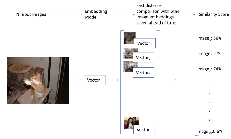 1/ We build an end-to-end model that is trained on all our images to take an image as an input, and output a similarity score over all of our images. Predictions happen quickly (one forward pass), but we would need to train a new model every time we add a new image. We would also quickly reach a state with so many classes that it would be extremely hard to optimize it correctly. This approach is fast, but does not scale to large datasets. In addition, we would have to label our dataset by hand with image similarities, which could be extremely time consuming.