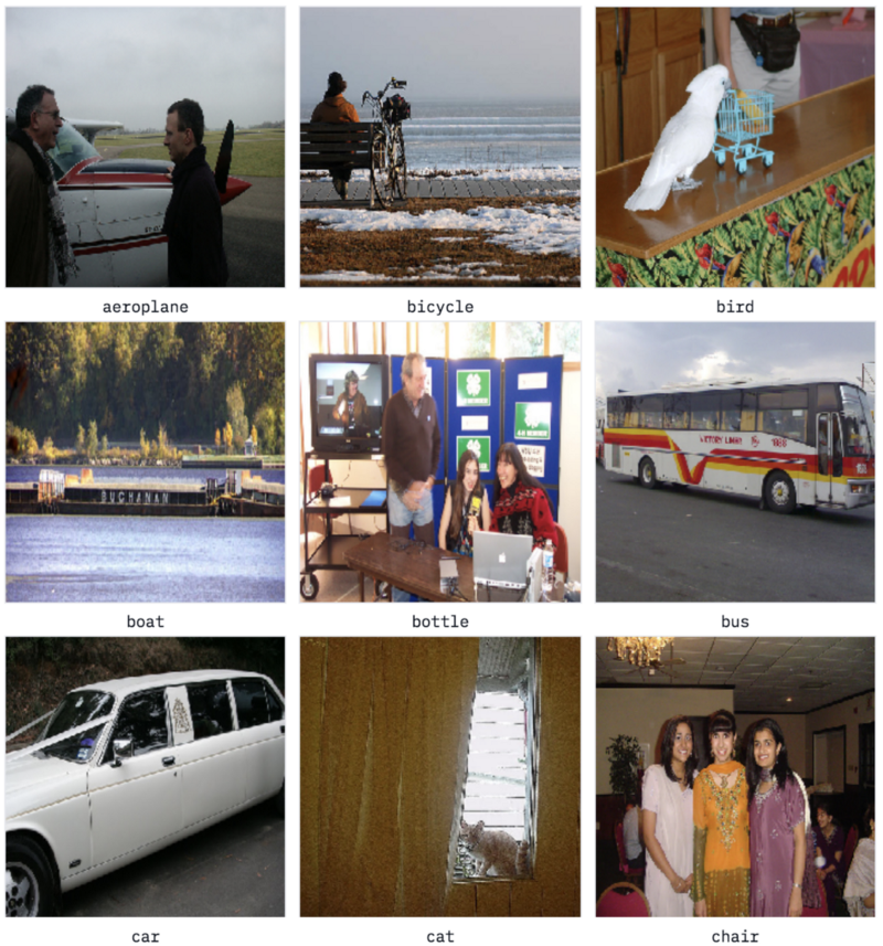 This dataset contains a category and a set of captions for every image. To make this problem harder, and to show how well our approach generalizes, we will only use the categories, and disregard the captions. We have a total of 20 classes, which I’ve listed out below: